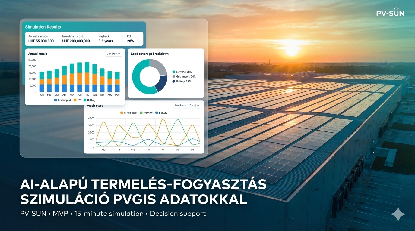 Az elmúlt hetek egyik legfontosabb mérföldkövét szeretnénk megosztani: elkészült a PV-SUN saját fejlesztésű, AI-val támogatott termelés–fogyasztás szimulációs és üzleti döntéstámogató szoftverének MVP (Minimum Viable Product) verziója.