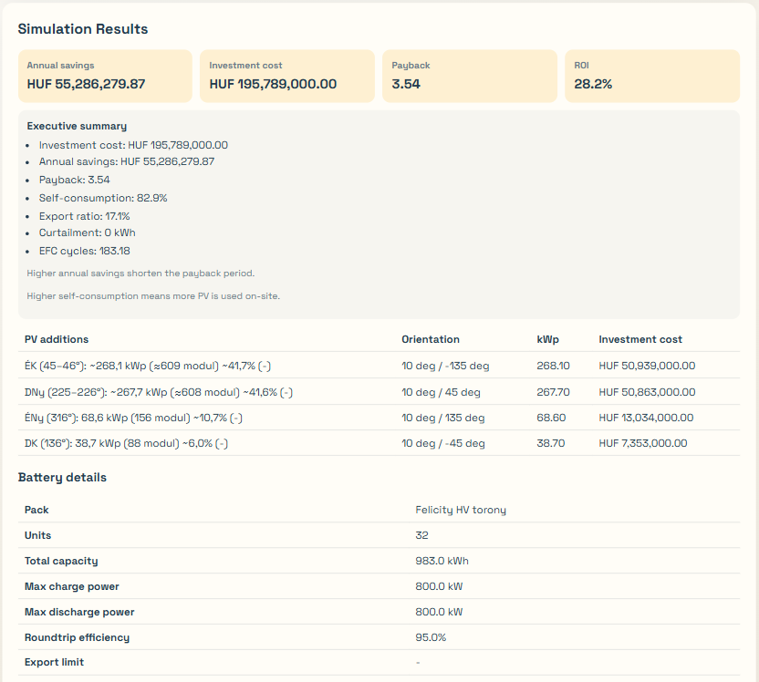 Fontos hangsúlyozni: ez jelenleg MVP verzió, a szoftver aktív fejlesztés alatt áll. Az MVP számunkra azt jelenti, hogy a mag “kész és működik”: valós adatokon, PVGIS termelési profilokon, negyedórás modellezéssel fut a szimuláció, és üzletileg értelmezhető adatot ad.