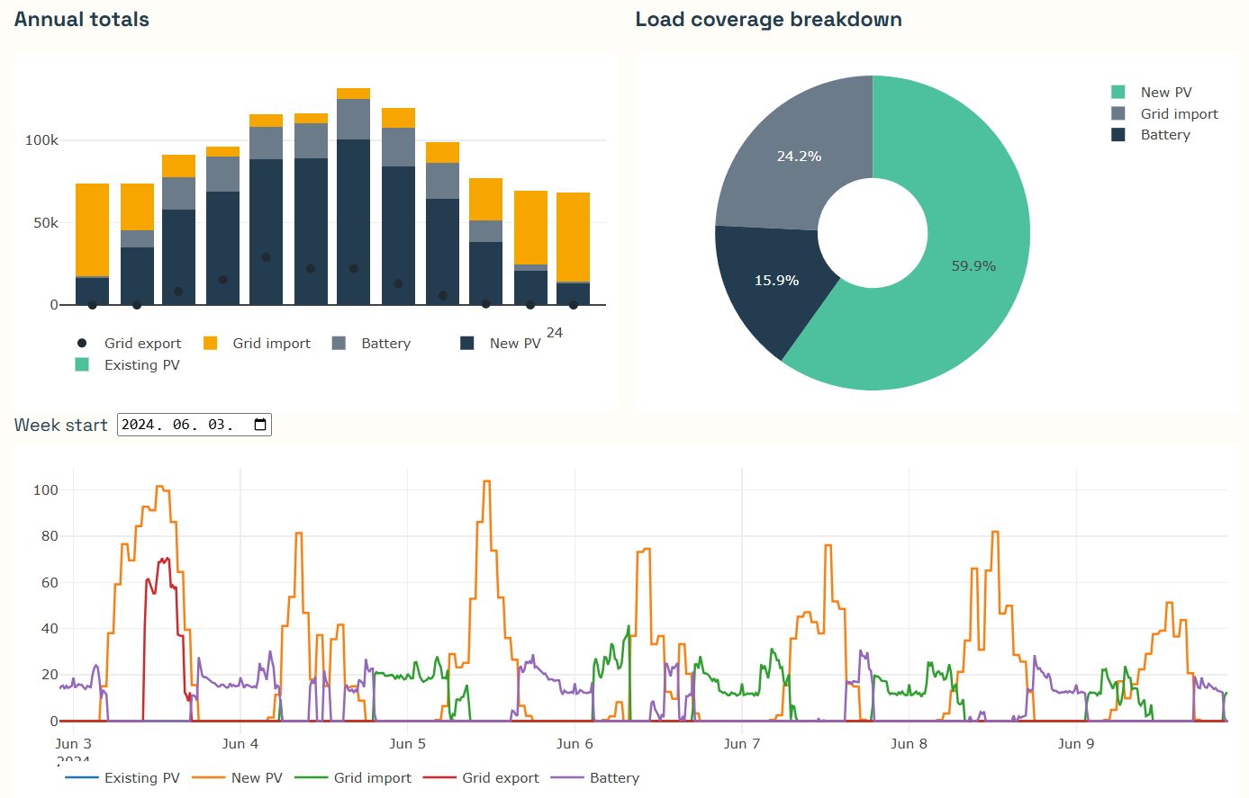 gyorsan lehet forgatókönyveket futtatni: “akku hozzáadása”, “PV bővítés”, “betáplálás korlátozás”,