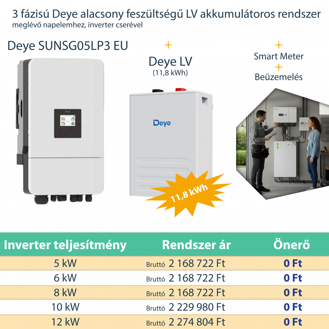 Meglévő rendszerhez – invertercsere + energiatároló (3 fázis, Deye LV + Deye SE-F12 11,8 kWh)